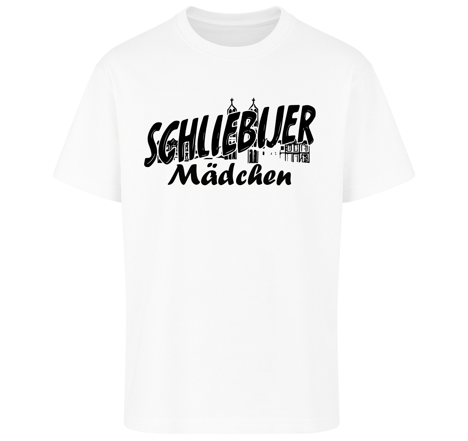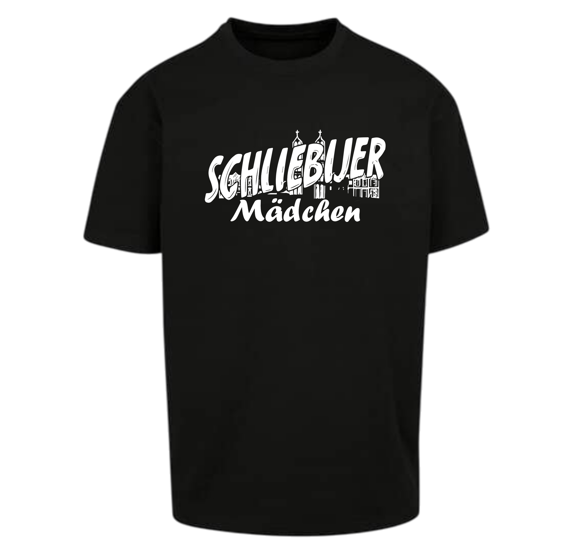 Der markante Schriftzug „Schliebijer Mädchen“ kombiniert mit der Skyline im Hintergrund verleiht dem Shirt einen modernen, urbanen Look – schlicht, aber mit Wiedererkennungswert.